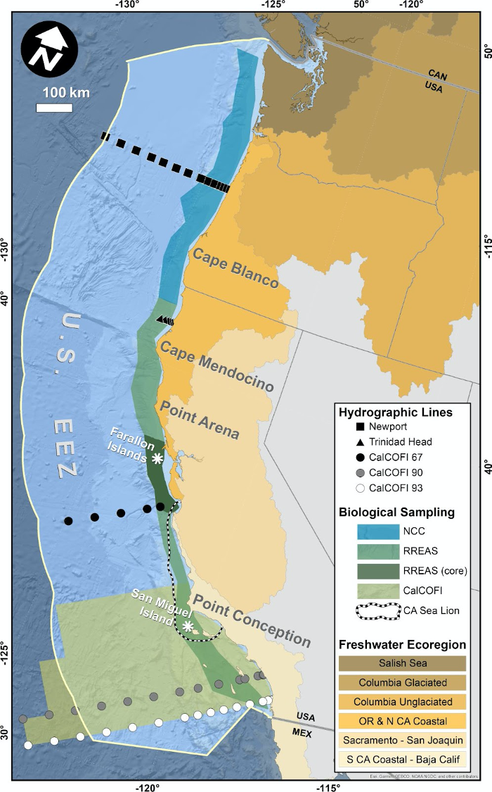 We generally refer to areas north of Cape Mendocino as the “Northern CCE,” Cape Mendocino to Point Conception as the “Central CCE”, and south of Point Conception as the “Southern CCE.” Figure 1 shows sampling areas for most regional oceanographic data. Key oceanographic transects are the Newport Line off Oregon, the Trinidad Head Line off northern California, and CalCOFI lines further south, while shaded marine regions indicate sampling areas for most biological surveys. This sampling is complemented by basin-scale oceanographic observations and by outputs from various models. Figure 1 also shows sampling areas for most biological indicators. The shaded terrestrial areas in Figure 1 represent freshwater ecoregions in the CCE, and are the basis by which we summarize indicators for snowpack, flows, and stream temperatures.
