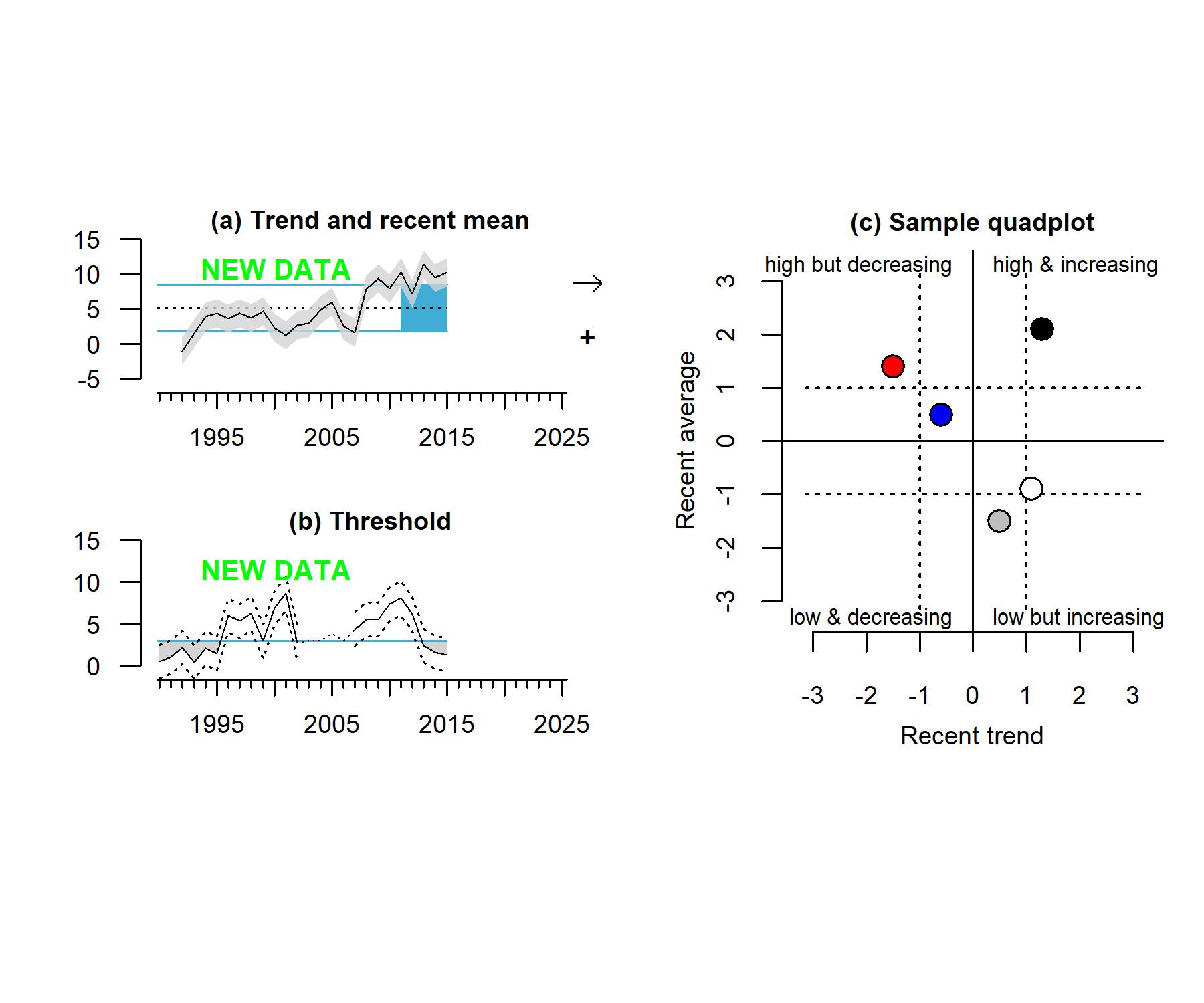 Sample quad plots (c) are also used in some other cases (e.g., streamflow), where each point represents one normalized time series. The position of a point indicates if the recent trend (x-axis) was increasing or decreasing over the evaluation period and whether the recent mean (y-axis) was above or below the evaluation period mean. Symbols fall therefore fall into quadrants based on recent average (high or low) and recent trend (increasing or decreasing) relative to a defined, long-term evaluation period.